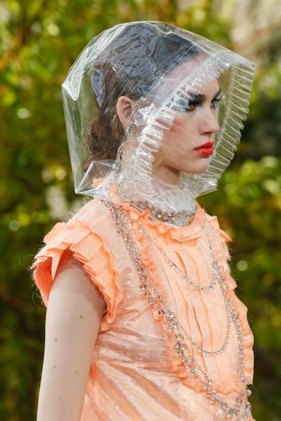 If you've spent a fortune on a Chanel tweed jacket, the last thing you want is to let the rain spoil it. Lagerfeld came up with a chic solution, clear plastic ponchos, hoods, scarves and capes that allow you to show off the look beneath, without getting wet. Even the gloves were clear - all the better to see the oversized diamond bracelets worn by the models. Alongside the see-through boots, rain hoods and oversize plastic shoppers, we're obsessing about little Hudson Kroenig's clear plastic baseball cap, created by the Maison Michel atelier. Need!