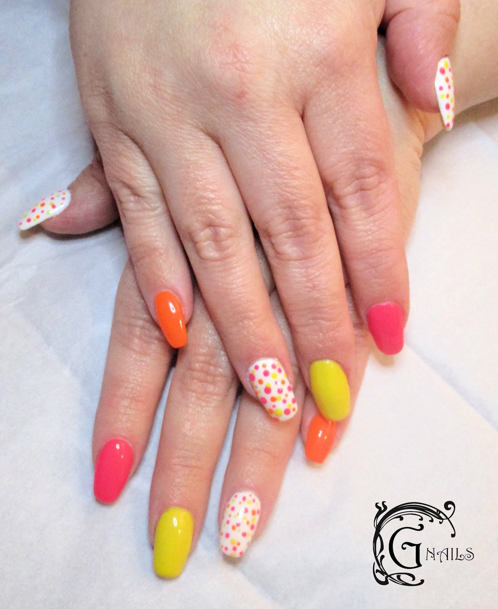 Acrylic Nails Pink And Yellow Summer Sculpted Stiletto Nails