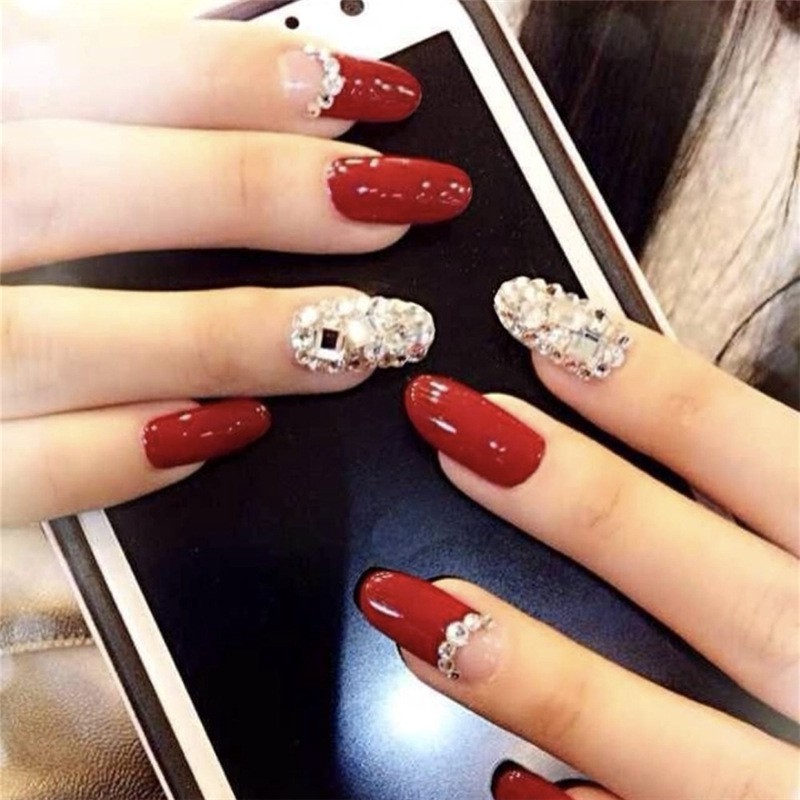 24pcs False Fake Nail Red Stone Silver Bling Press On Manicure